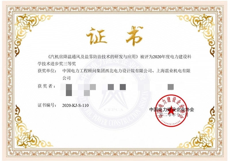 近日,上海震業(yè)機(jī)電有限公司和中國(guó)電力工程顧問(wèn)集團(tuán)西北電力設(shè)計(jì)院有限公司聯(lián)合開(kāi)發(fā)的《汽機(jī)房通風(fēng)降溫和除鹽霧系統(tǒng)》被評(píng)為2020電力建設(shè)科技進(jìn)步三等獎(jiǎng)。