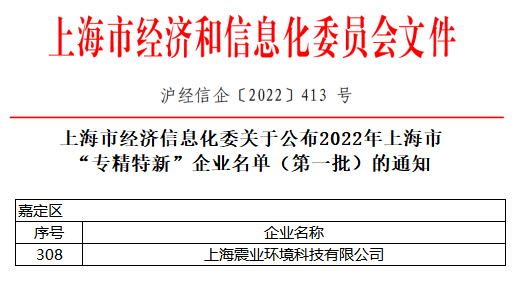 震業(yè)環(huán)境入選2022年上海市第一批“專精特新”企業(yè)。