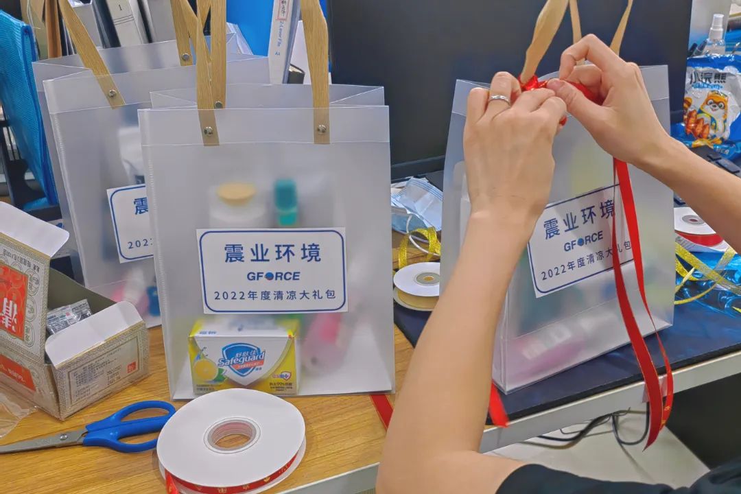 因此,公司為每位員工精心準(zhǔn)備了夏日清涼大禮包:免洗消毒液、定制袖套等降暑用品100余份。