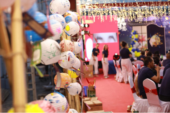 每個(gè)人都在各自分組的月亮燈上畫上圖案色彩,精美的月亮燈掛在活動(dòng)現(xiàn)場(chǎng)的燈籠墻上,