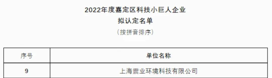 根據(jù)《關于開展2022年度上海市科技小巨人及嘉定區(qū)科技小巨人工程項目申報工作的通知》和《嘉定區(qū)科技小巨人企業(yè)認定管理實施細則(試行)》等文件要求,經(jīng)公開申報、材料初審、專家評審等相關程序,現(xiàn)上海震業(yè)環(huán)境科技有限公司已獲批2022年度嘉定區(qū)科技小巨人企業(yè)。